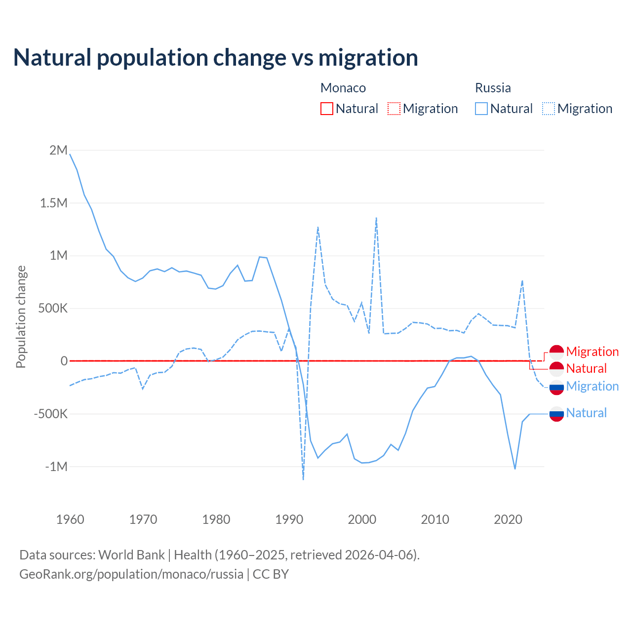 Over the last 10 years, 37.3% of the population change in Monaco is from natural causes (a loss of 4,357 people) and 62.7% is from migration (a gain of 7,333 people). In Russia 48.6% is from natural causes (a loss of 3,416,377 people) and 51.4% is from migration (a gain of 3,611,826 people).