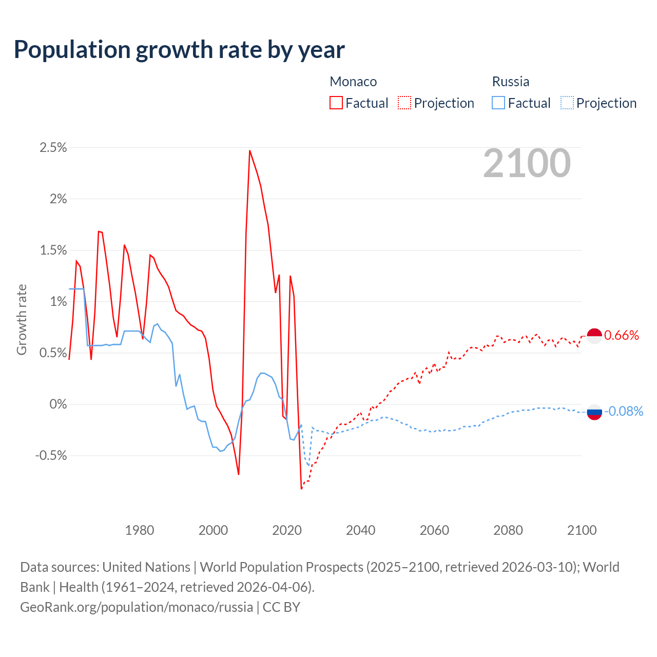 - For the last 10 years, Monaco has had an average growth rate of +0.79% per year vs -0.02% in Russia.