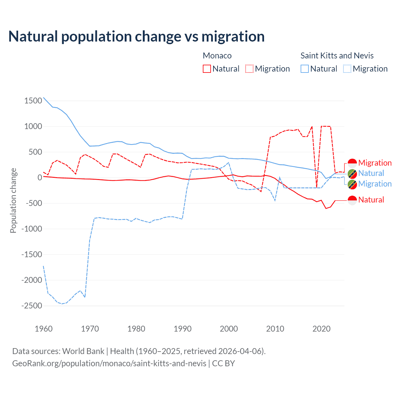 Over the last 10 years, 37.3% of the population change in Monaco is from natural causes (a loss of 4,357 people) and 62.7% is from migration (a gain of 7,333 people). In Saint Kitts and Nevis 44.9% is from natural causes (a gain of 1,225 people) and 55.1% is from migration (a loss of 1,506 people).