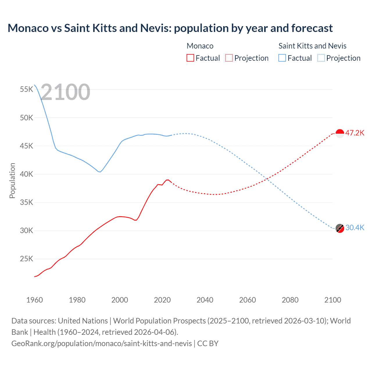 The latest officially reported population of Monaco was 38,631 in 2024 vs 46,843 people in Saint Kitts and Nevis in 2024. In 2026, based on the adjusted UN estimation, the current Monaco's population is 38,053 people compared to 47,017 in Saint Kitts and Nevis.