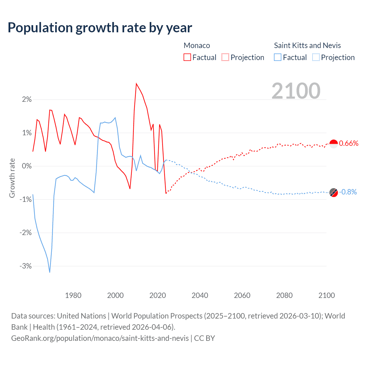 - For the last 10 years, Monaco has had an average growth rate of +0.79% per year vs -0.04% in Saint Kitts and Nevis.