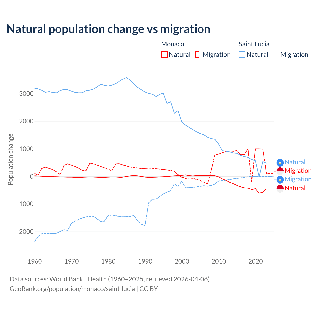 Over the last 10 years, 37.3% of the population change in Monaco is from natural causes (a loss of 4,357 people) and 62.7% is from migration (a gain of 7,333 people). In Saint Lucia 95.7% is from natural causes (a gain of 6,039 people) and 4.31% is from migration (a loss of 272 people).