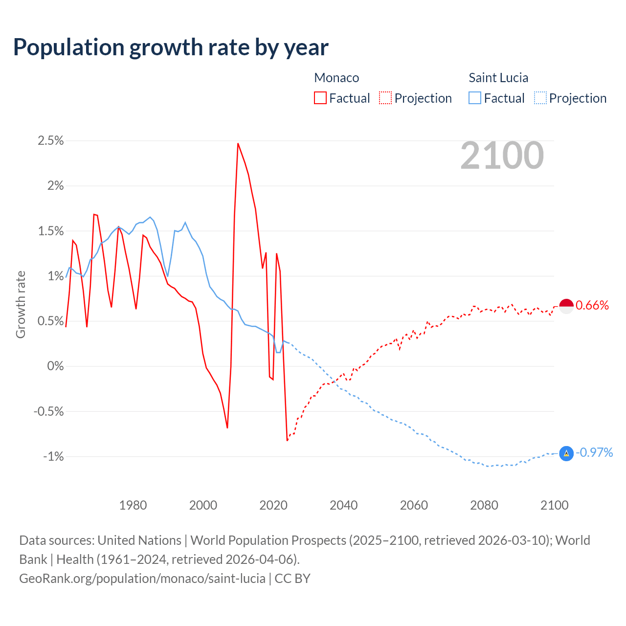 - For the last 10 years, Monaco has had an average growth rate of +0.79% per year vs +0.33% in Saint Lucia.