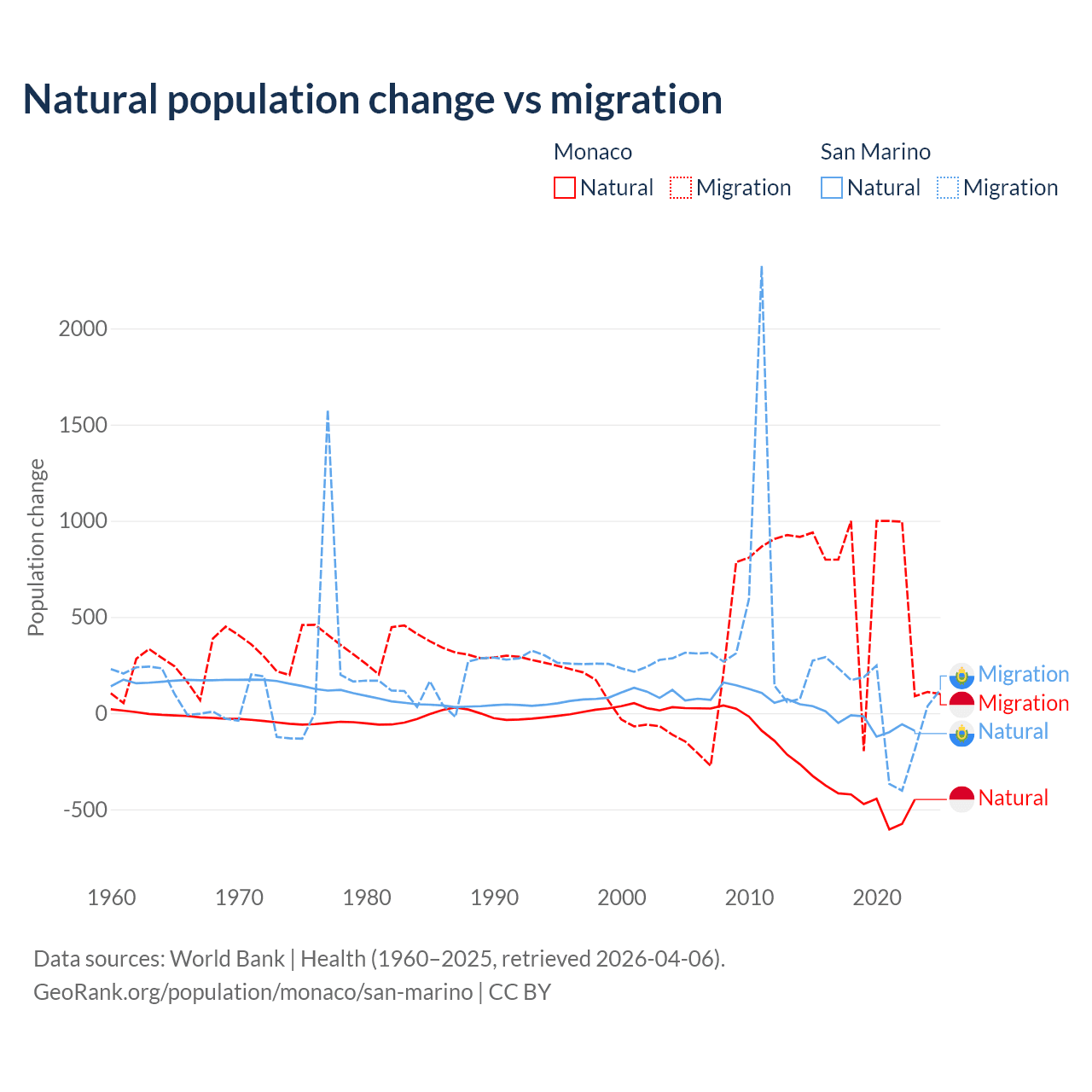 Over the last 10 years, 37.3% of the population change in Monaco is from natural causes (a loss of 4,357 people) and 62.7% is from migration (a gain of 7,333 people). In San Marino 40.9% is from natural causes (a loss of 358 people) and 59.1% is from migration (a gain of 517 people).