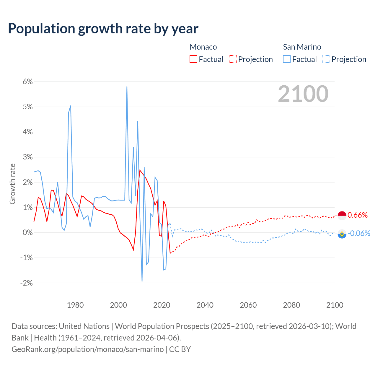 - For the last 10 years, Monaco has had an average growth rate of +0.79% per year vs +0.26% in San Marino.