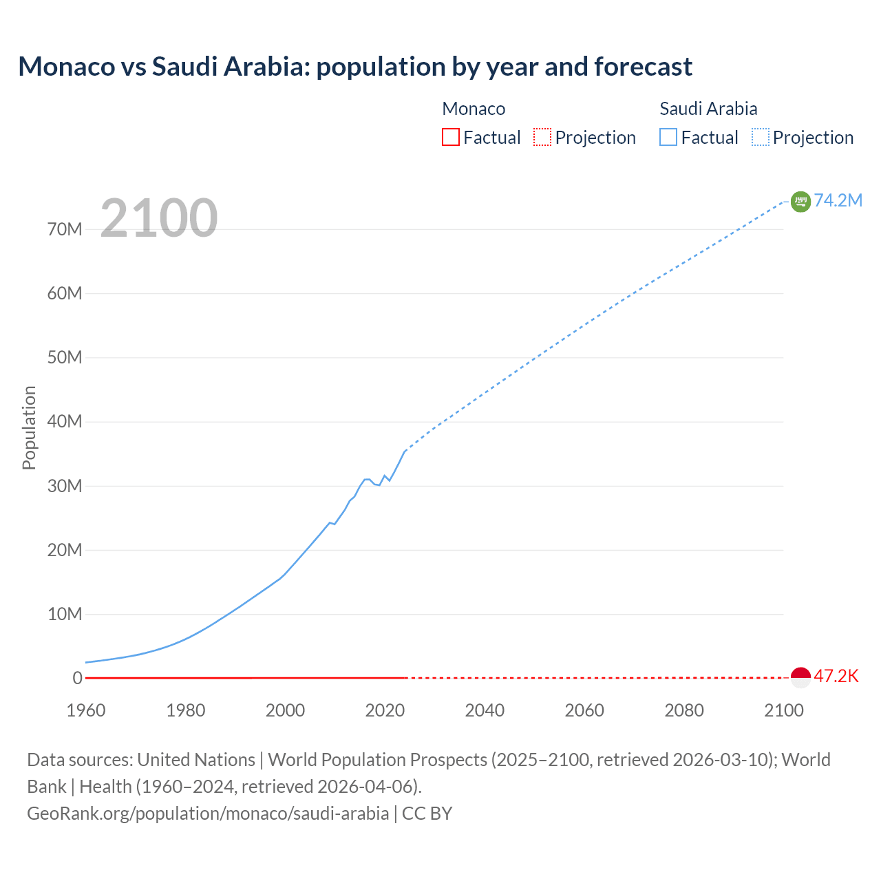 Monaco vs Saudi Arabia: population by year and forecast