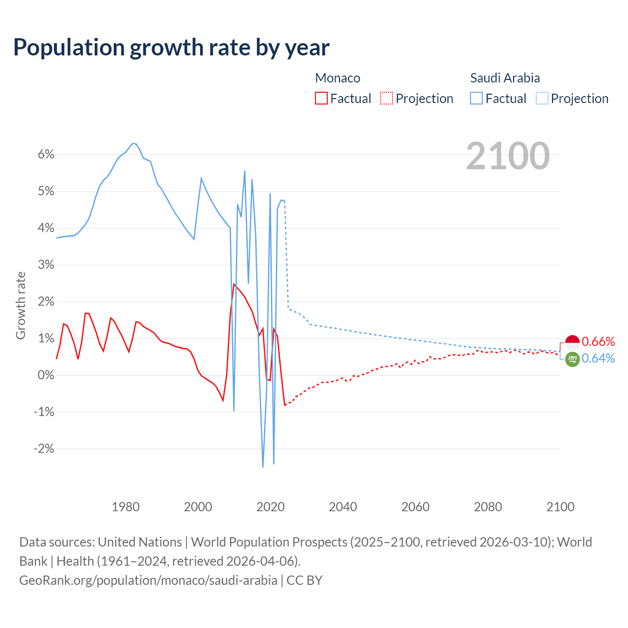 - For the last 10 years, Monaco has had an average growth rate of +0.79% per year vs +2.3% in Saudi Arabia.