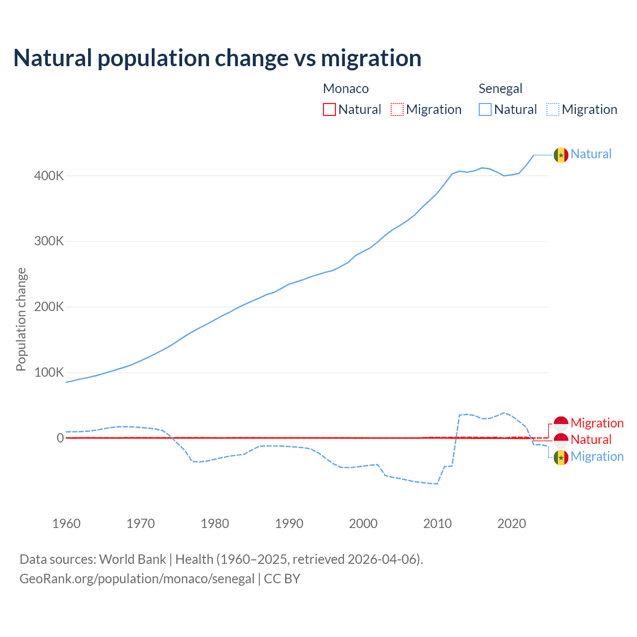 Over the last 10 years, 37.3% of the population change in Monaco is from natural causes (a loss of 4,357 people) and 62.7% is from migration (a gain of 7,333 people). In Senegal 93.9% is from natural causes (a gain of 4,089,205 people) and 6.13% is from migration (a gain of 267,266 people).