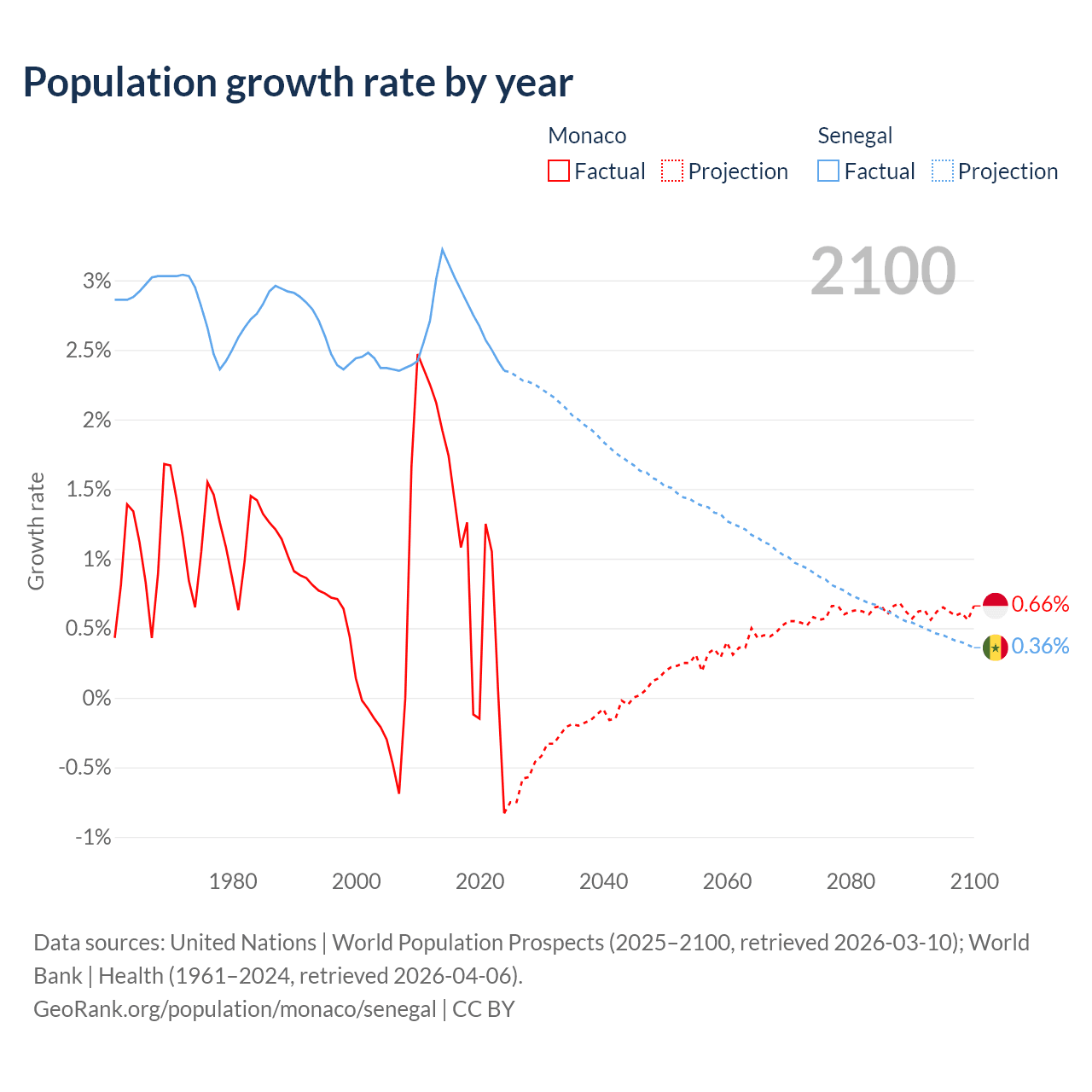 - For the last 10 years, Monaco has had an average growth rate of +0.79% per year vs +2.76% in Senegal.