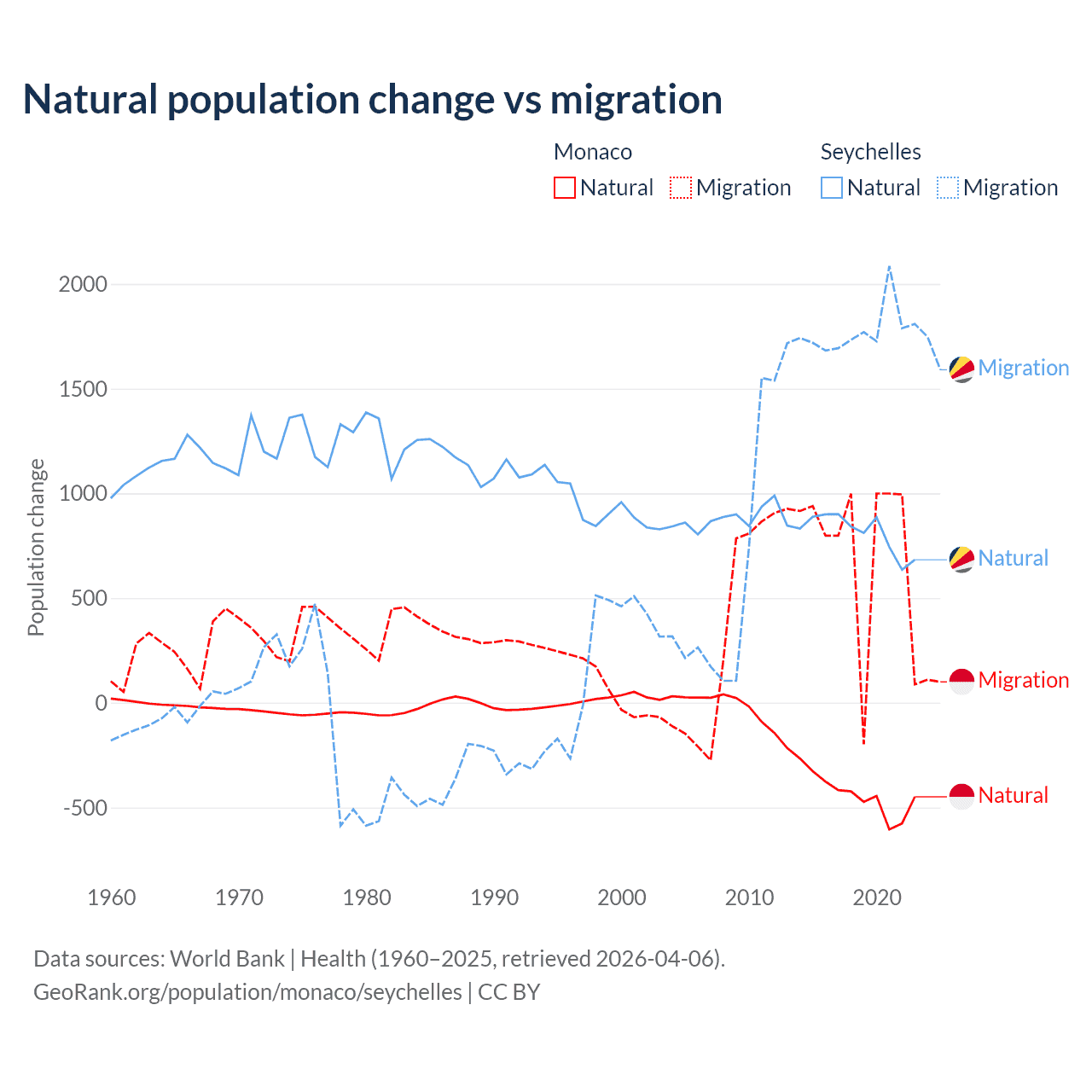 Over the last 10 years, 37.3% of the population change in Monaco is from natural causes (a loss of 4,357 people) and 62.7% is from migration (a gain of 7,333 people). In the Seychelles 31.4% is from natural causes (a gain of 8,122 people) and 68.6% is from migration (a gain of 17,748 people).