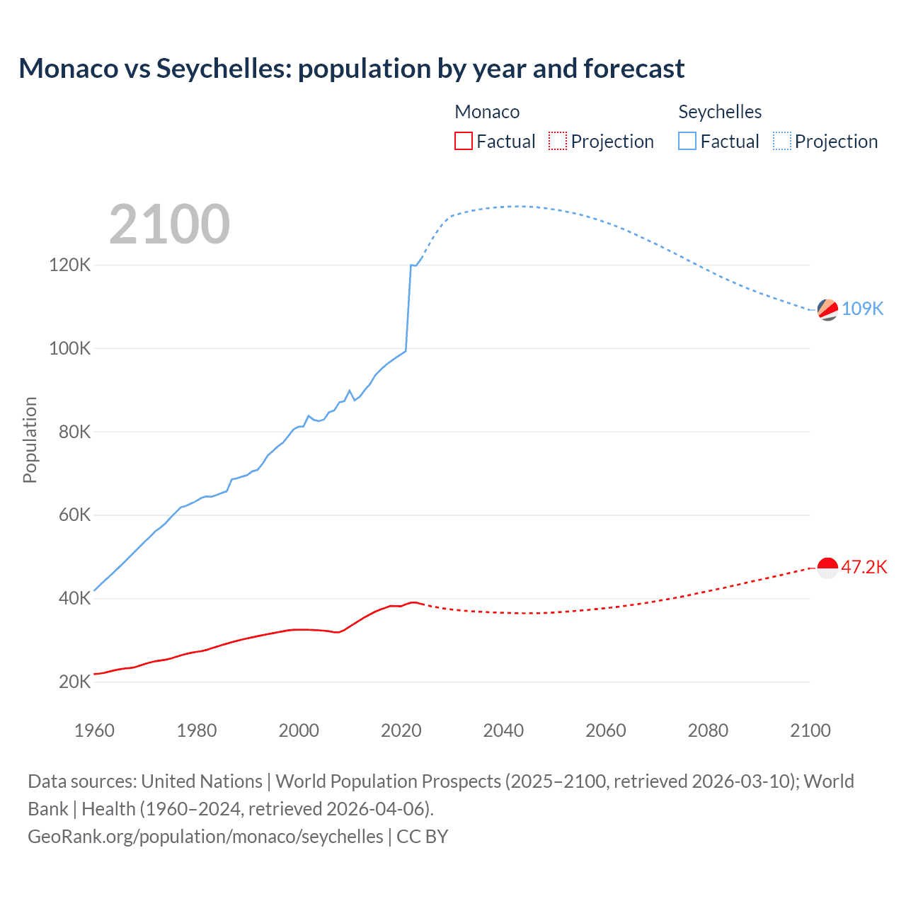 The latest officially reported population of Monaco was 38,631 in 2024 vs 121,354 people in the Seychelles in 2024. In 2026, based on the adjusted UN estimation, the current Monaco's population is 38,053 people compared to 126,311 in the Seychelles.