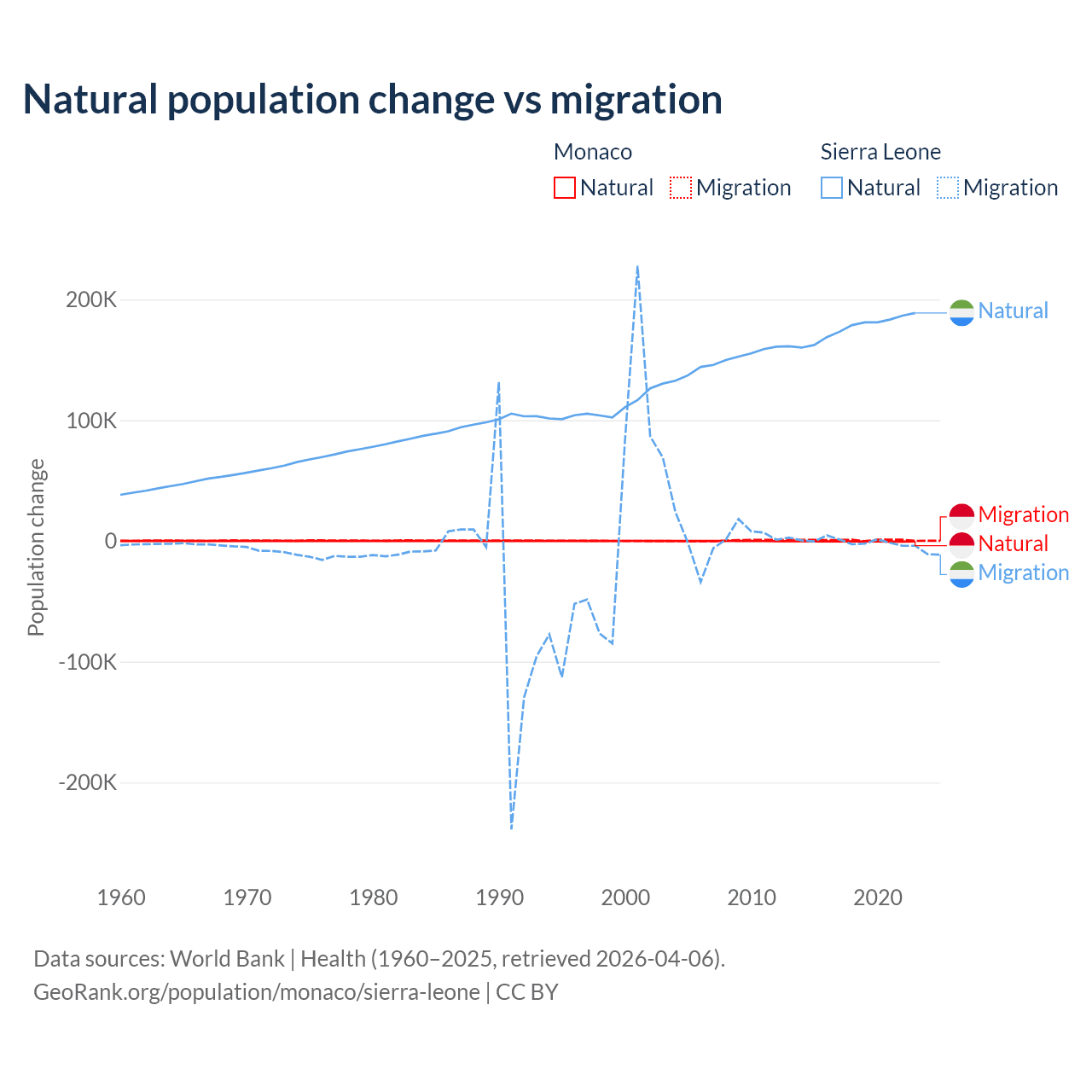 Over the last 10 years, 37.3% of the population change in Monaco is from natural causes (a loss of 4,357 people) and 62.7% is from migration (a gain of 7,333 people). In Sierra Leone 99.6% is from natural causes (a gain of 1,764,049 people) and 0.41% is from migration (a loss of 7,211 people).