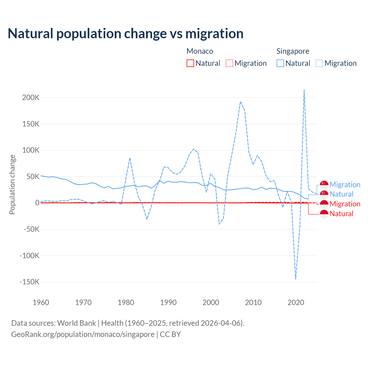 Over the last 10 years, 37.3% of the population change in Monaco is from natural causes (a loss of 4,357 people) and 62.7% is from migration (a gain of 7,333 people). In Singapore 54.8% is from natural causes (a gain of 195,953 people) and 45.2% is from migration (a gain of 161,805 people).