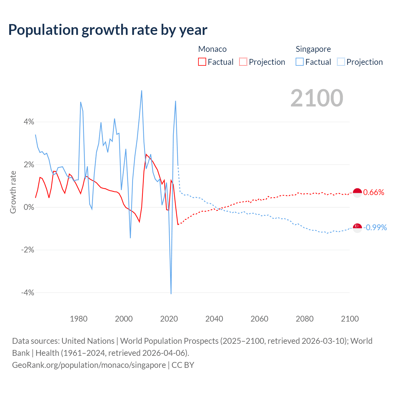 - For the last 10 years, Monaco has had an average growth rate of +0.79% per year vs +1.04% in Singapore.