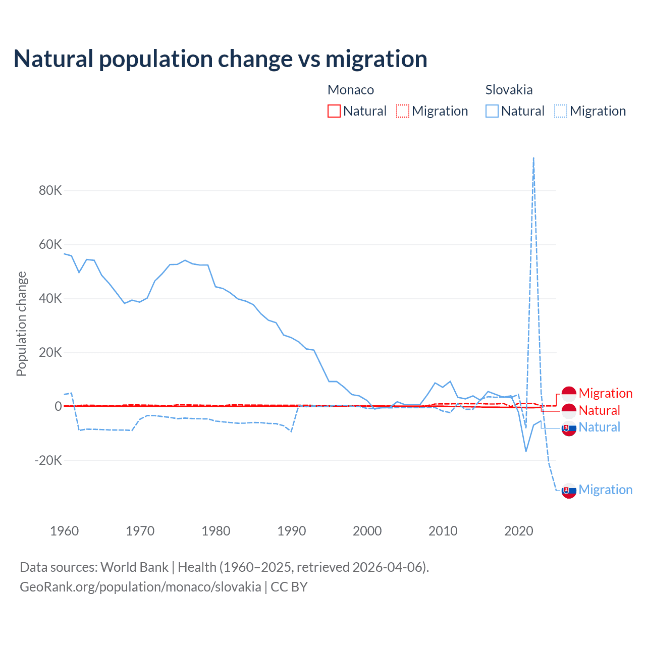 Over the last 10 years, 37.3% of the population change in Monaco is from natural causes (a loss of 4,357 people) and 62.7% is from migration (a gain of 7,333 people). In Slovakia 7.47% is from natural causes (a loss of 8,728 people) and 92.5% is from migration (a gain of 108,156 people).