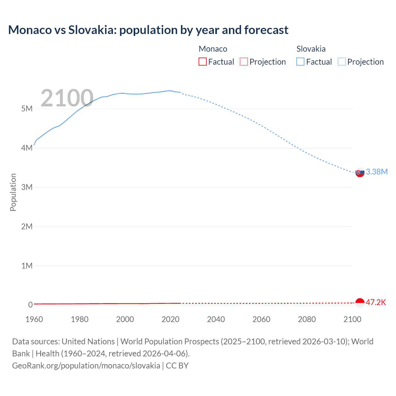 The latest officially reported population of Monaco was 38,631 in 2024 vs 5,422,069 people in Slovakia in 2024. In 2026, based on the adjusted UN estimation, the current Monaco's population is 38,053 people compared to 5,359,438 in Slovakia.