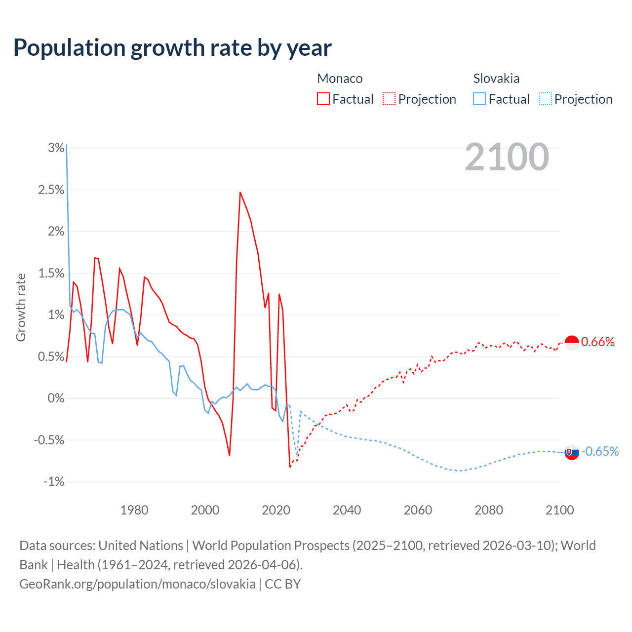 - For the last 10 years, Monaco has had an average growth rate of +0.79% per year vs +0.01% in Slovakia.