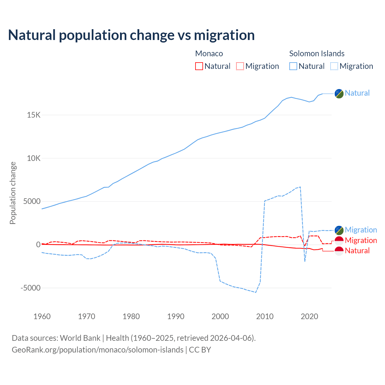Over the last 10 years, 37.3% of the population change in Monaco is from natural causes (a loss of 4,357 people) and 62.7% is from migration (a gain of 7,333 people). In the Solomon Islands 82.8% is from natural causes (a gain of 168,727 people) and 17.2% is from migration (a gain of 35,031 people).