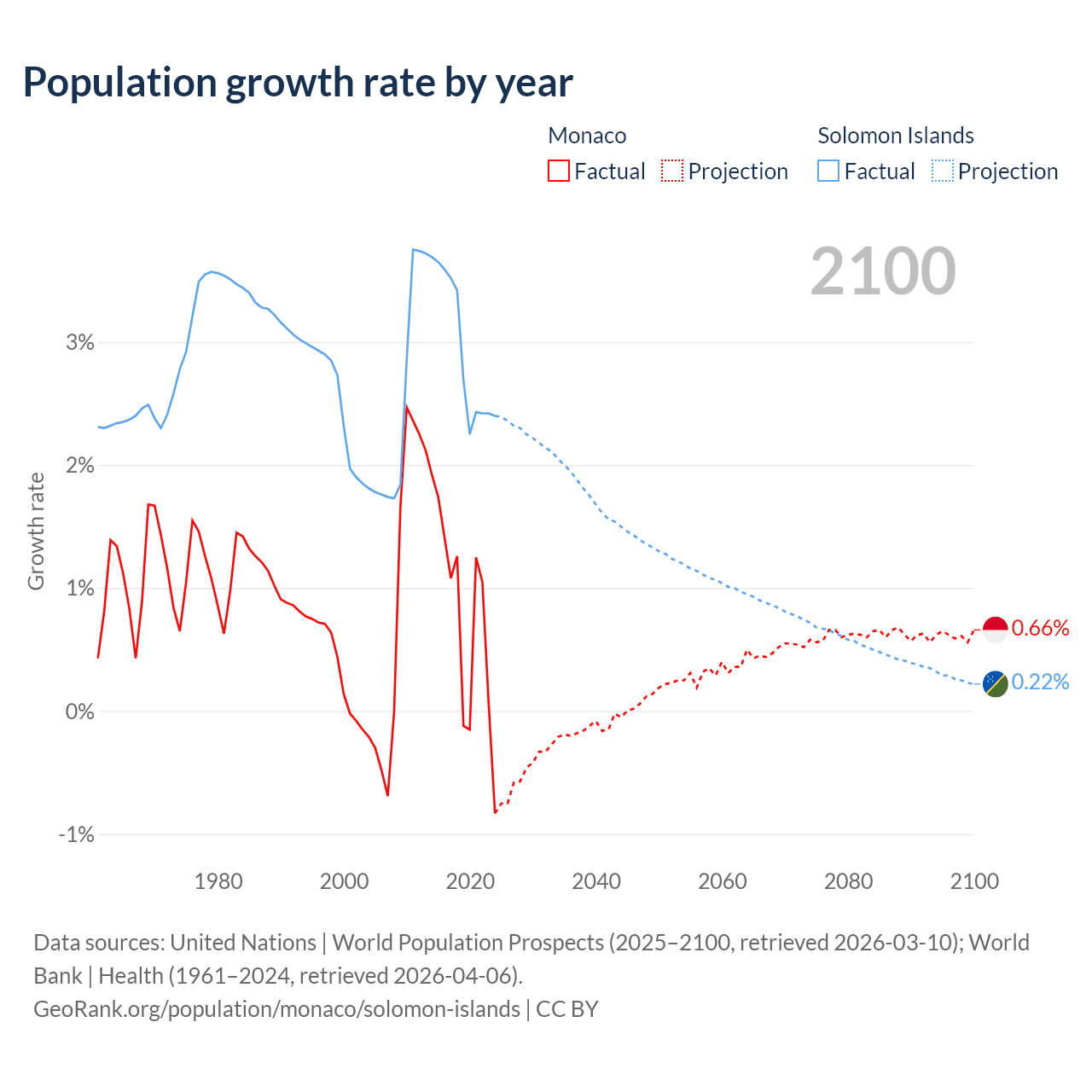 - For the last 10 years, Monaco has had an average growth rate of +0.79% per year vs +2.95% in the Solomon Islands.