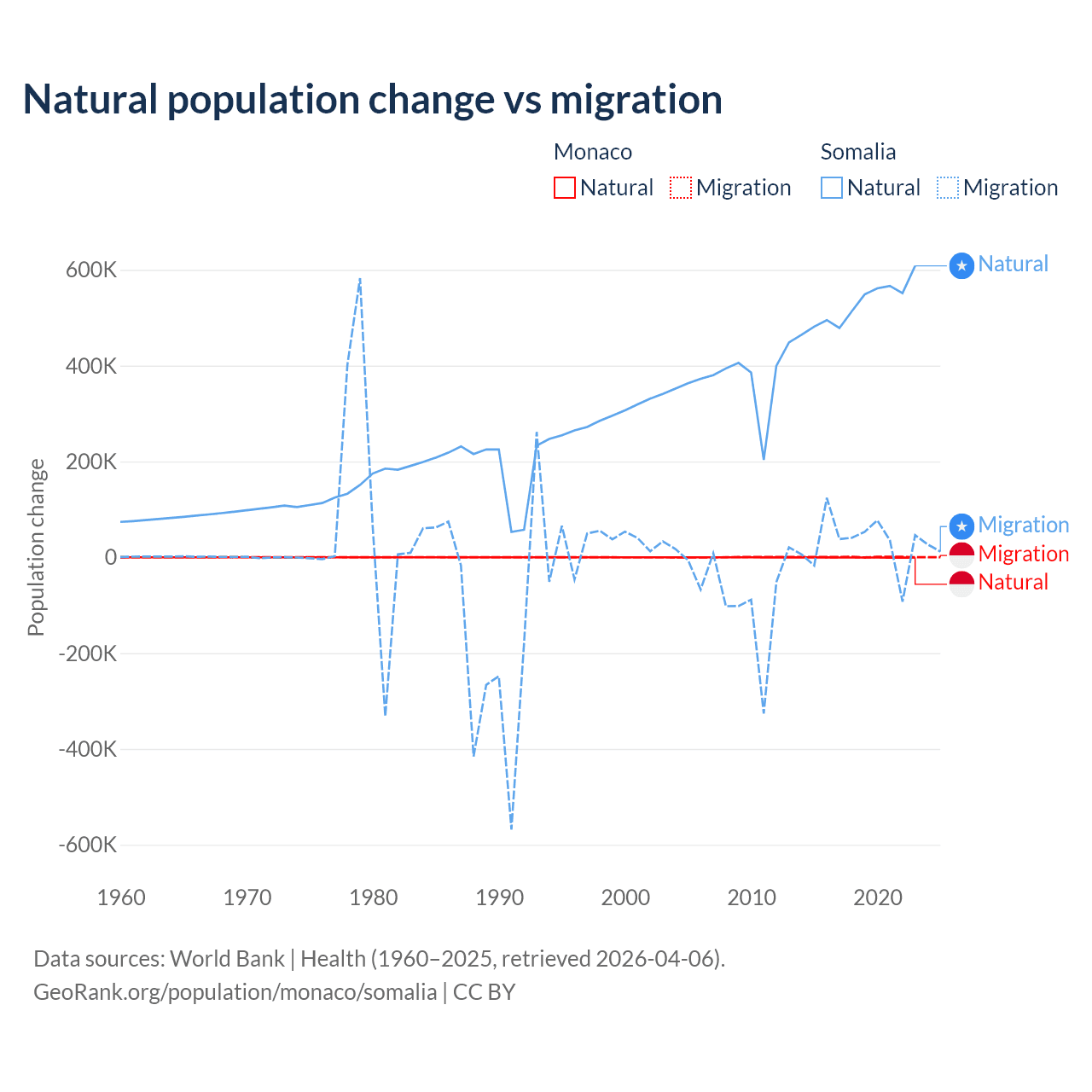 Over the last 10 years, 37.3% of the population change in Monaco is from natural causes (a loss of 4,357 people) and 62.7% is from migration (a gain of 7,333 people). In Somalia 94.4% is from natural causes (a gain of 5,270,105 people) and 5.58% is from migration (a gain of 311,487 people).