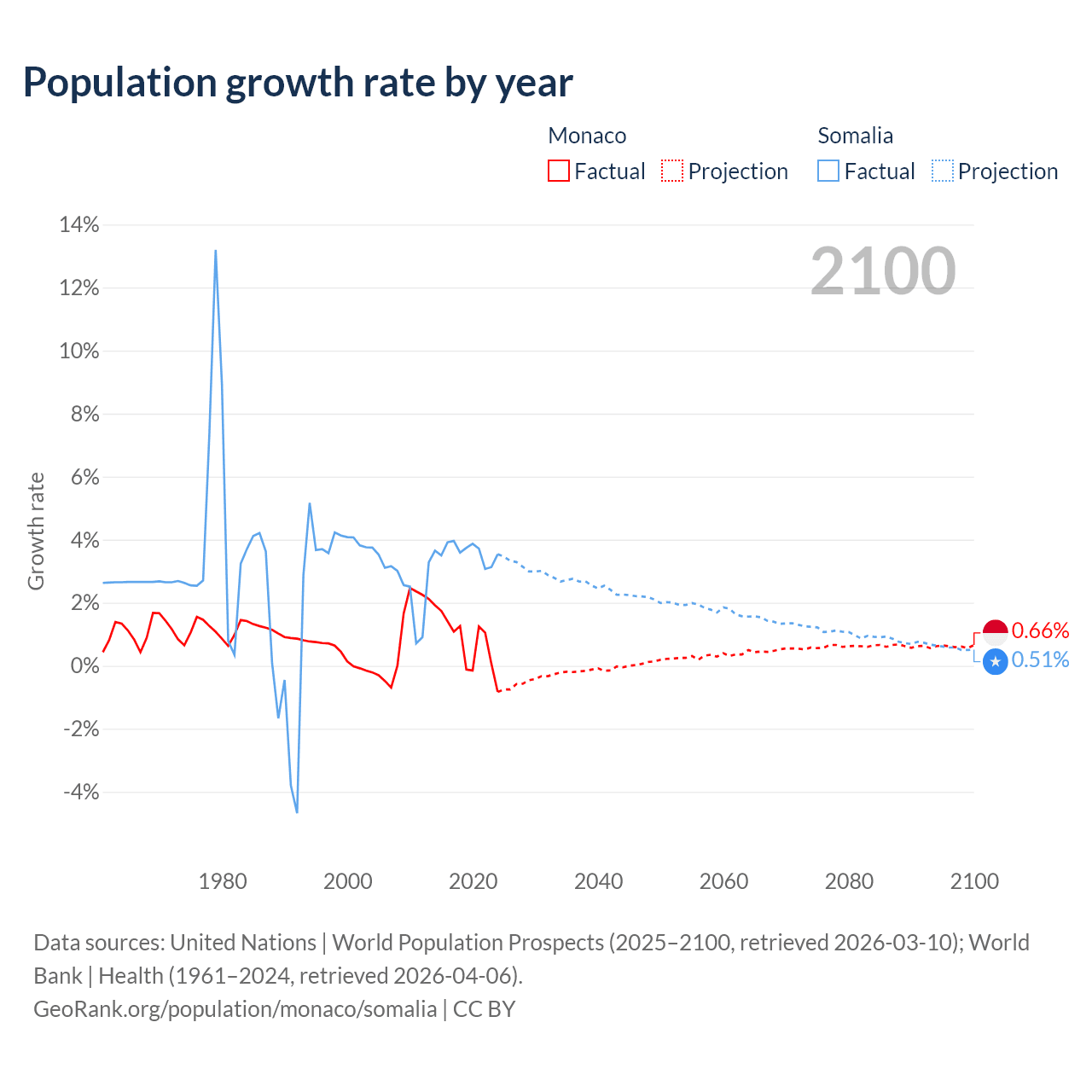 - For the last 10 years, Monaco has had an average growth rate of +0.79% per year vs +3.61% in Somalia.