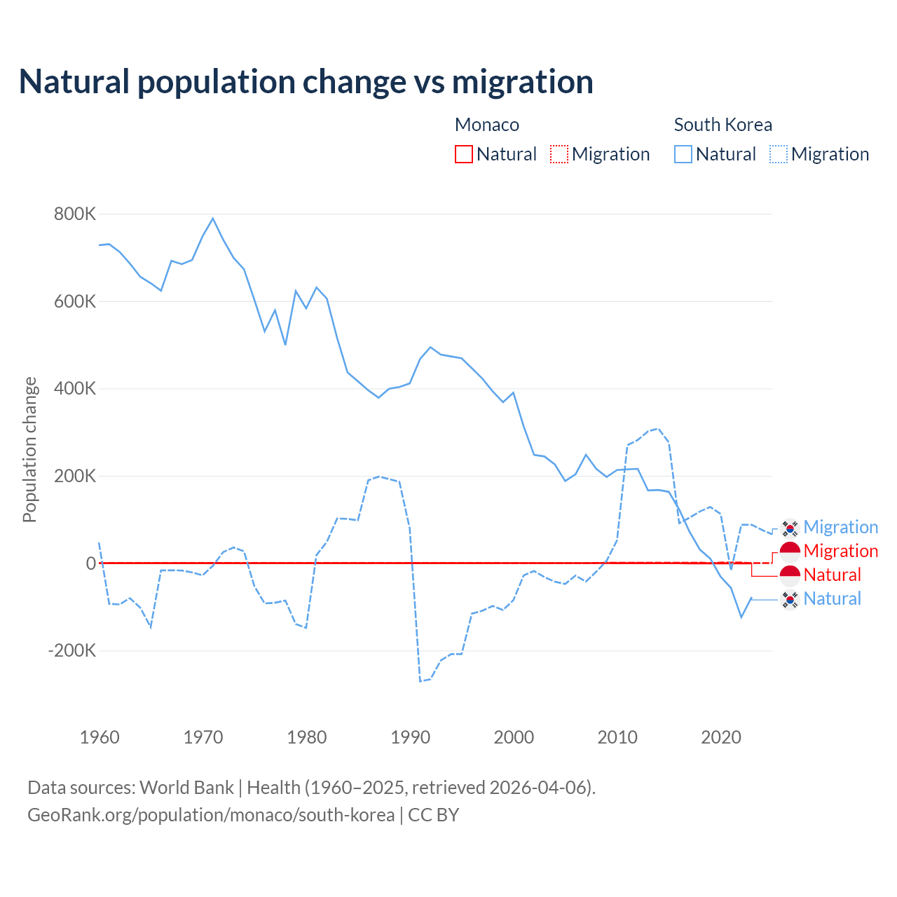 Over the last 10 years, 37.3% of the population change in Monaco is from natural causes (a loss of 4,357 people) and 62.7% is from migration (a gain of 7,333 people). In South Korea 17.6% is from natural causes (a gain of 277,215 people) and 82.4% is from migration (a gain of 1,298,356 people).