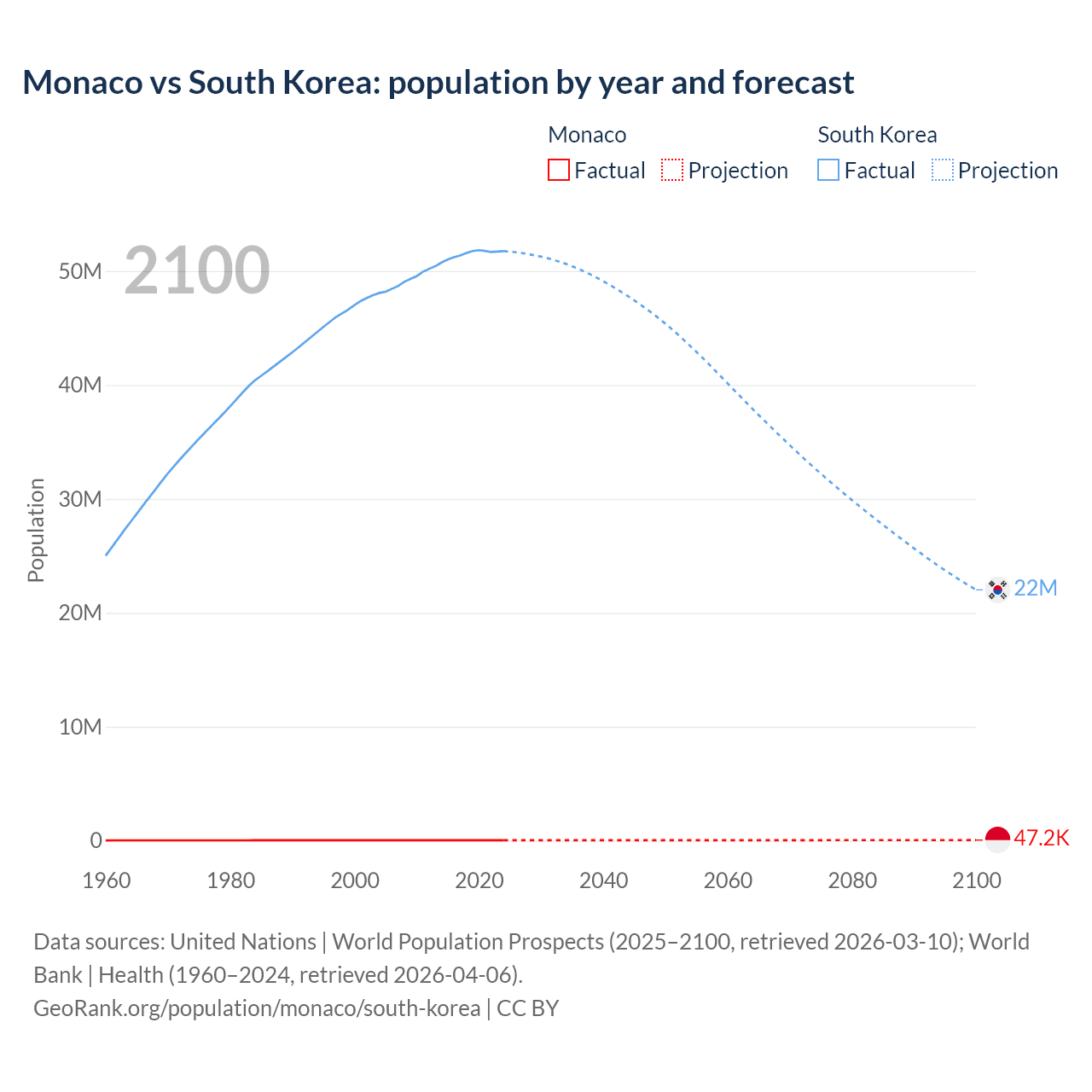 The latest officially reported population of Monaco was 38,631 in 2024 vs 51,751,065 people in South Korea in 2024. In 2026, based on the adjusted UN estimation, the current Monaco's population is 38,053 people compared to 51,649,918 in South Korea.