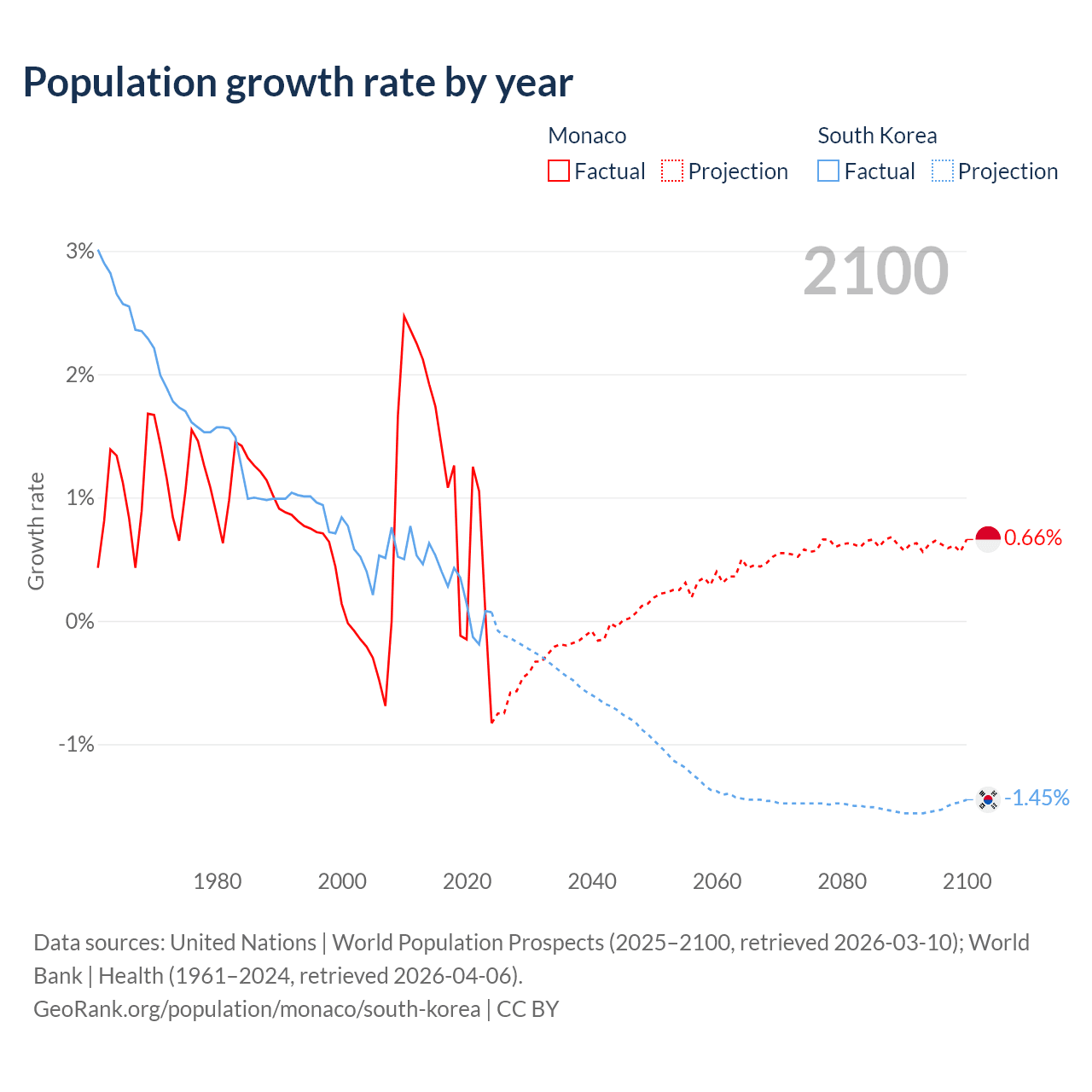 - For the last 10 years, Monaco has had an average growth rate of +0.79% per year vs +0.24% in South Korea.