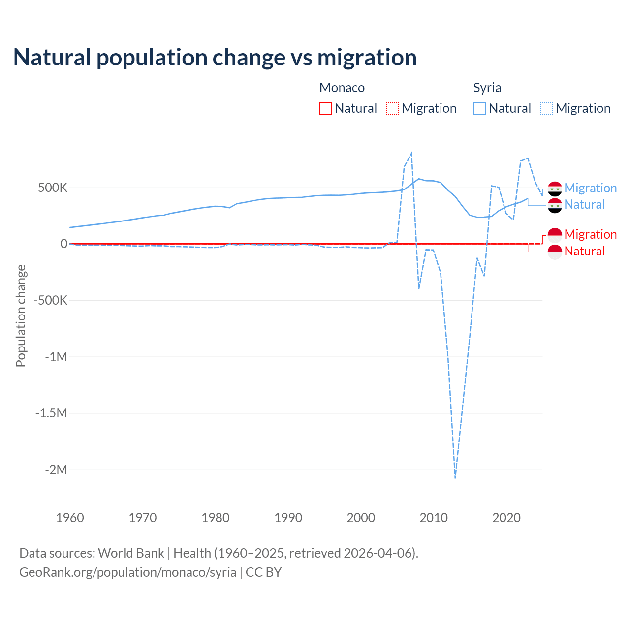 Over the last 10 years, 37.3% of the population change in Monaco is from natural causes (a loss of 4,357 people) and 62.7% is from migration (a gain of 7,333 people). In Syria 91.3% is from natural causes (a gain of 3,047,621 people) and 8.72% is from migration (a gain of 291,069 people).