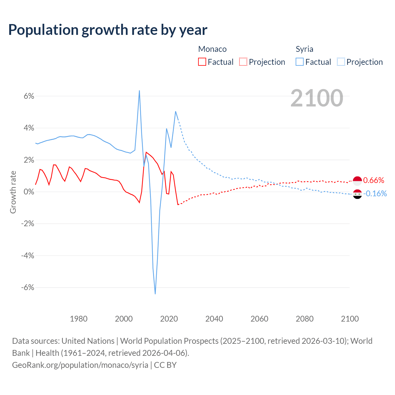 - For the last 10 years, Monaco has had an average growth rate of +0.79% per year vs +1.25% in Syria.