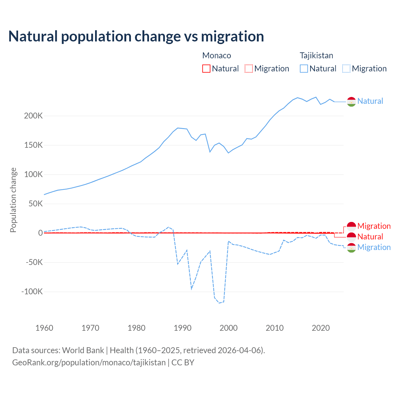 Over the last 10 years, 37.3% of the population change in Monaco is from natural causes (a loss of 4,357 people) and 62.7% is from migration (a gain of 7,333 people). In Tajikistan 96% is from natural causes (a gain of 2,266,045 people) and 3.95% is from migration (a loss of 93,205 people).