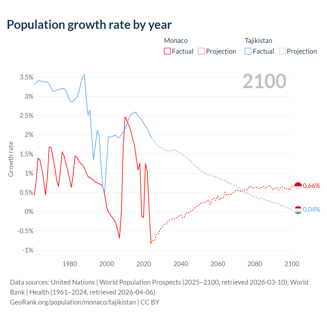 - For the last 10 years, Monaco has had an average growth rate of +0.79% per year vs +2.33% in Tajikistan.