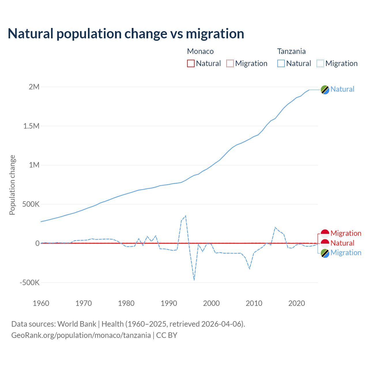 Over the last 10 years, 37.3% of the population change in Monaco is from natural causes (a loss of 4,357 people) and 62.7% is from migration (a gain of 7,333 people). In Tanzania 98.7% is from natural causes (a gain of 17,769,541 people) and 1.27% is from migration (a gain of 229,466 people).
