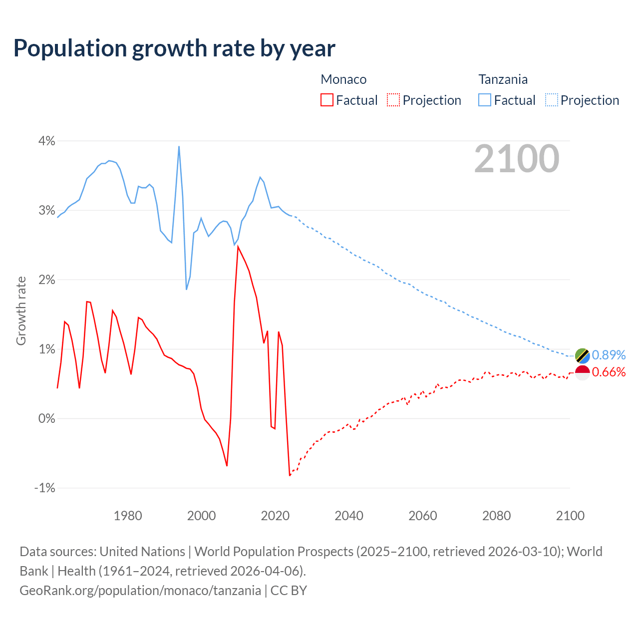- For the last 10 years, Monaco has had an average growth rate of +0.79% per year vs +3.13% in Tanzania.