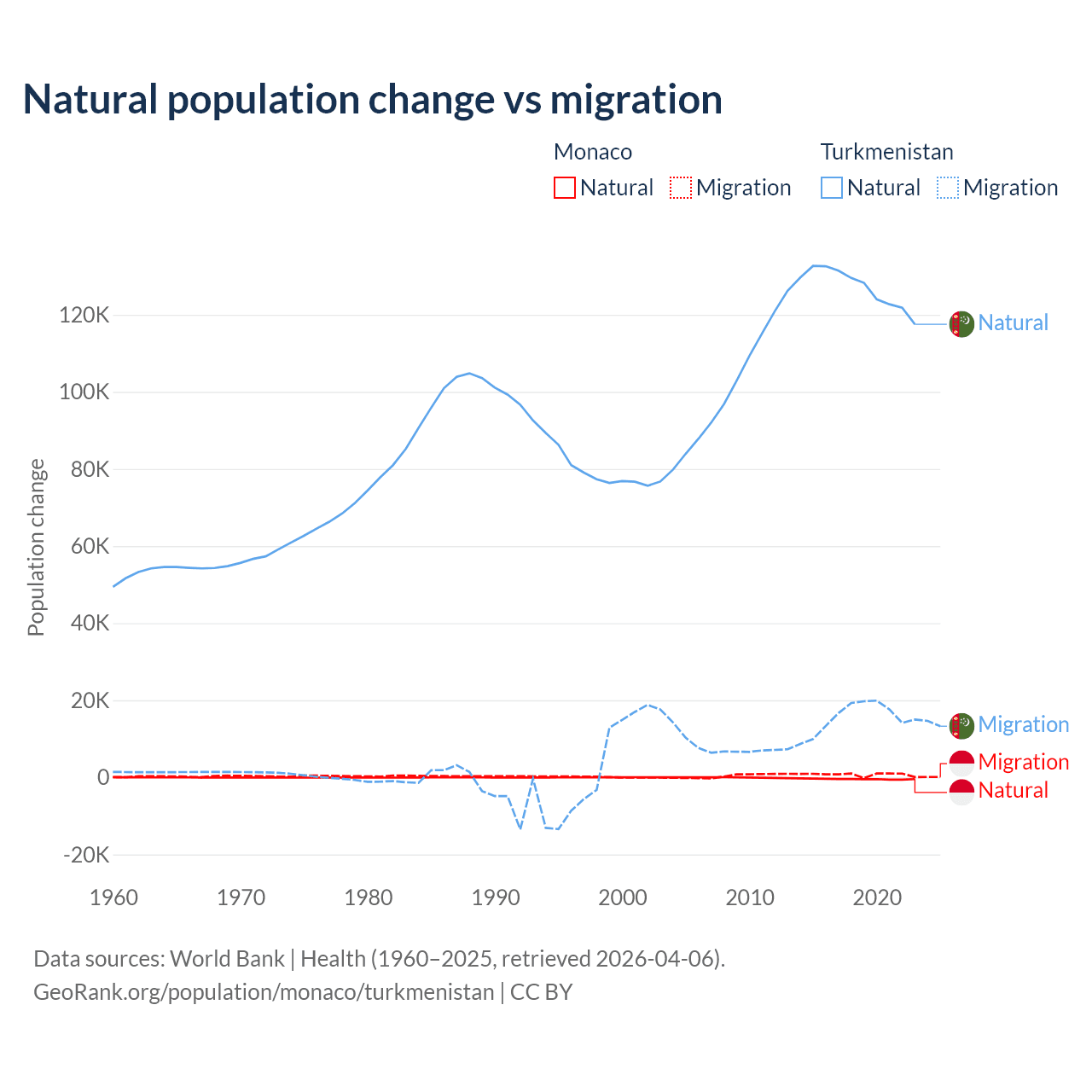 Over the last 10 years, 37.3% of the population change in Monaco is from natural causes (a loss of 4,357 people) and 62.7% is from migration (a gain of 7,333 people). In Turkmenistan 89.2% is from natural causes (a gain of 1,270,228 people) and 10.8% is from migration (a gain of 154,379 people).