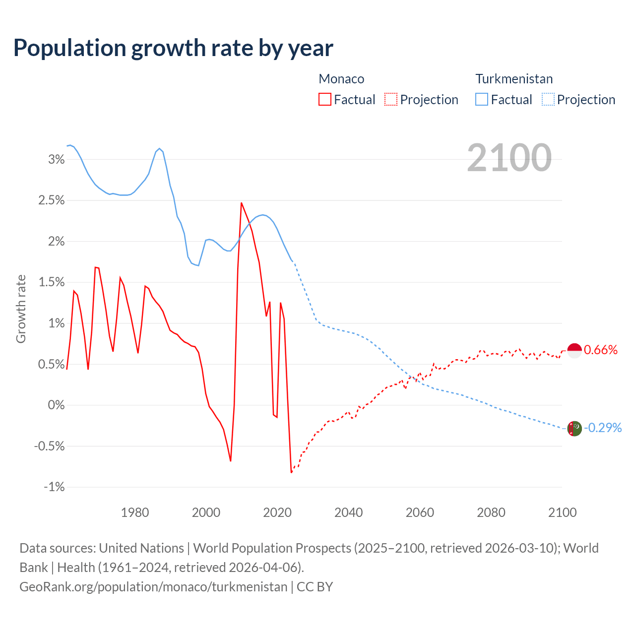 - For the last 10 years, Monaco has had an average growth rate of +0.79% per year vs +2.14% in Turkmenistan.