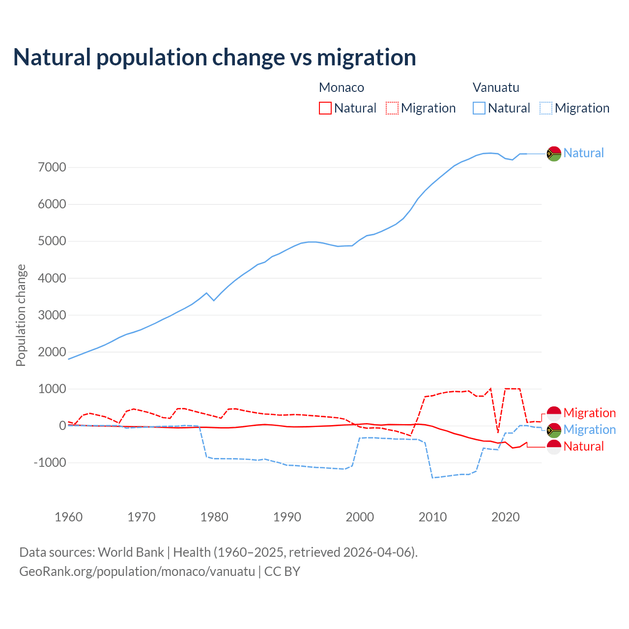 Over the last 10 years, 37.3% of the population change in Monaco is from natural causes (a loss of 4,357 people) and 62.7% is from migration (a gain of 7,333 people). In Vanuatu 92.2% is from natural causes (a gain of 72,941 people) and 7.81% is from migration (a loss of 6,181 people).
