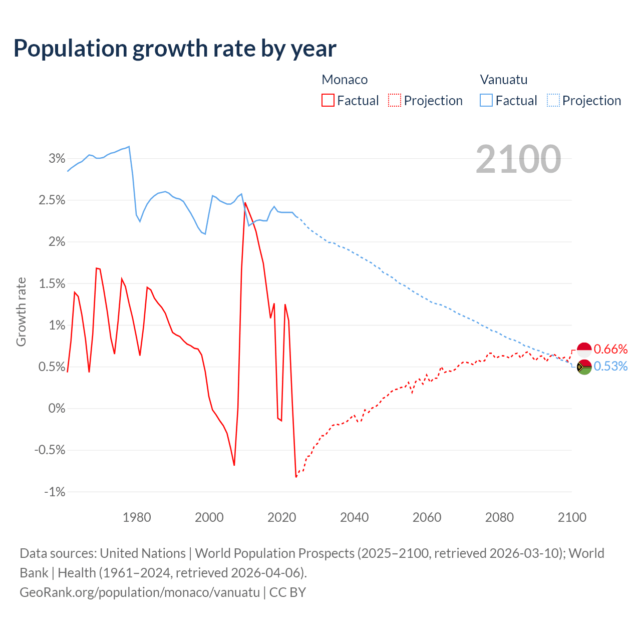 - For the last 10 years, Monaco has had an average growth rate of +0.79% per year vs +2.33% in Vanuatu.