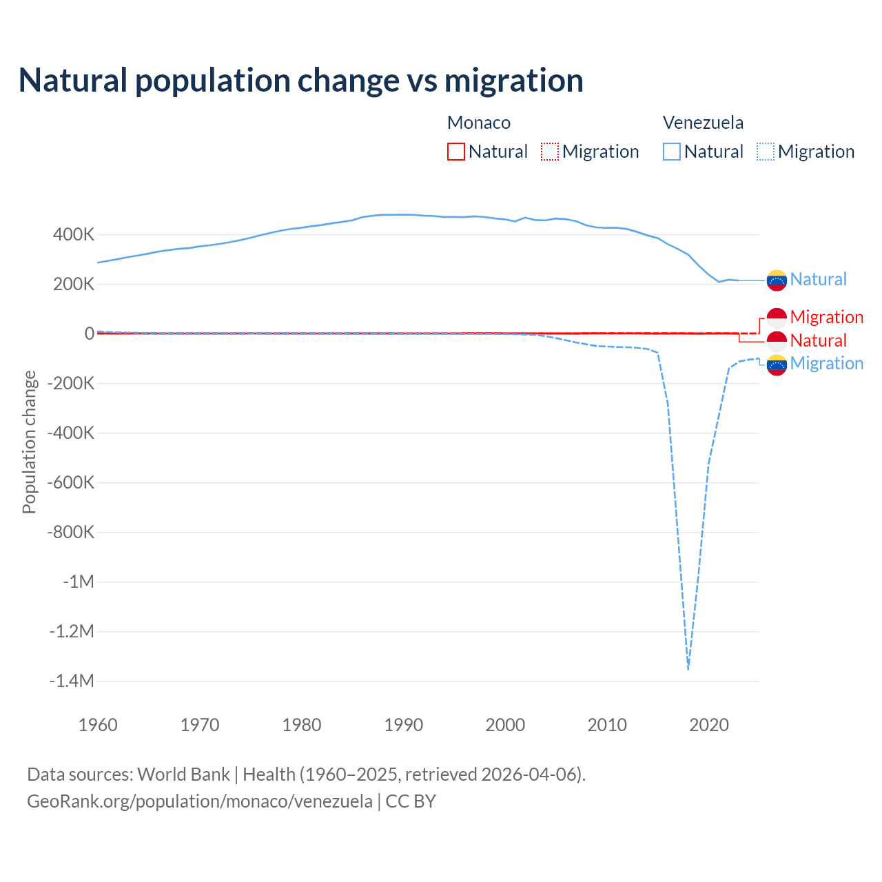 Over the last 10 years, 37.3% of the population change in Monaco is from natural causes (a loss of 4,357 people) and 62.7% is from migration (a gain of 7,333 people). In Venezuela 38.6% is from natural causes (a gain of 2,946,257 people) and 61.4% is from migration (a loss of 4,683,227 people).