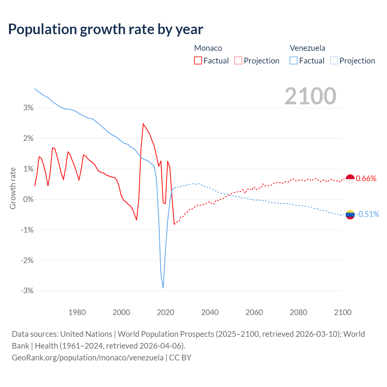 - For the last 10 years, Monaco has had an average growth rate of +0.79% per year vs -0.46% in Venezuela.