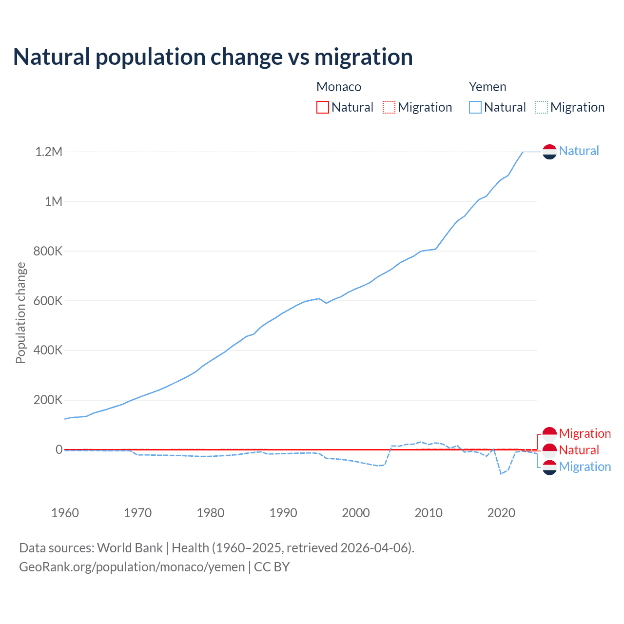 Over the last 10 years, 37.3% of the population change in Monaco is from natural causes (a loss of 4,357 people) and 62.7% is from migration (a gain of 7,333 people). In Yemen 97.8% is from natural causes (a gain of 10,460,813 people) and 2.17% is from migration (a loss of 231,814 people).