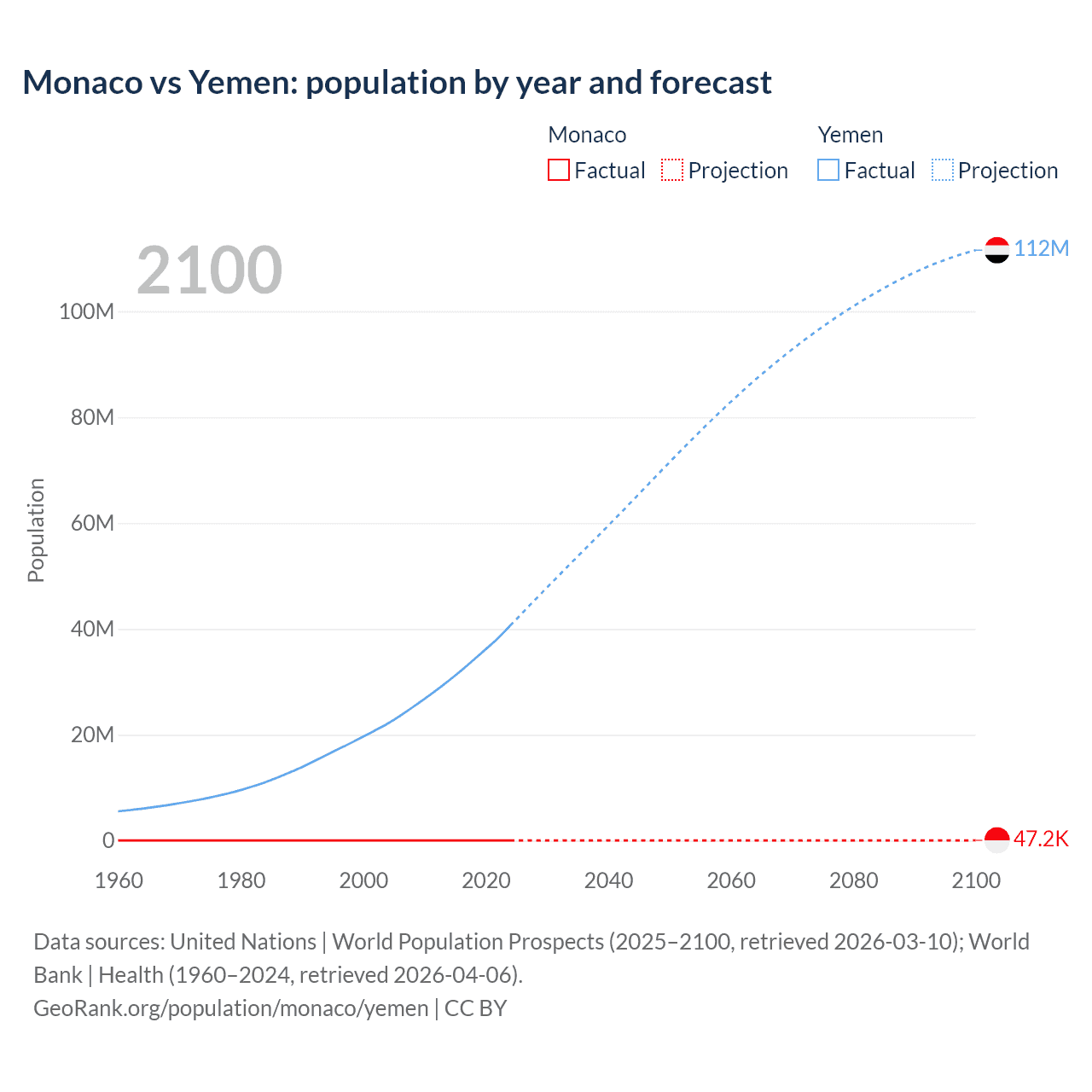 The latest officially reported population of Monaco was 38,631 in 2024 vs 40,583,164 people in Yemen in 2024. In 2026, based on the adjusted UN estimation, the current Monaco's population is 38,053 people compared to 43,325,643 in Yemen.