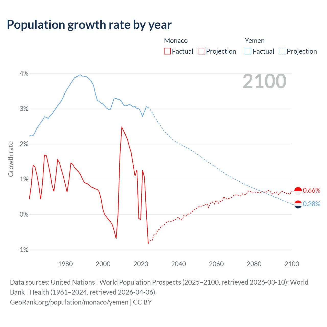 - For the last 10 years, Monaco has had an average growth rate of +0.79% per year vs +3% in Yemen.