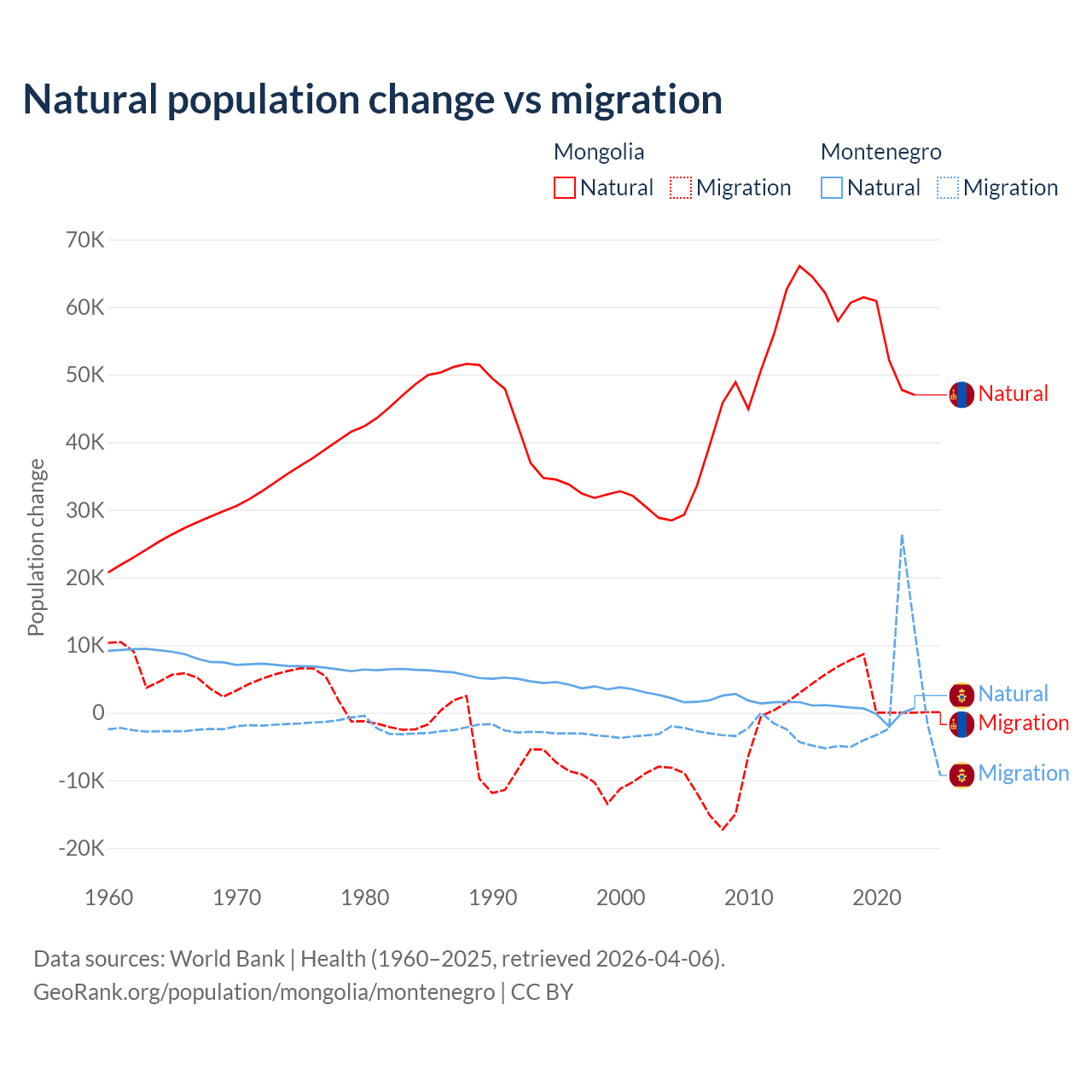 Over the last 10 years, 94.1% of the population change in Mongolia is from natural causes (a gain of 580,367 people) and 5.87% is from migration (a gain of 36,163 people). In Montenegro 52.4% is from natural causes (a gain of 4,501 people) and 47.6% is from migration (a gain of 4,095 people).
