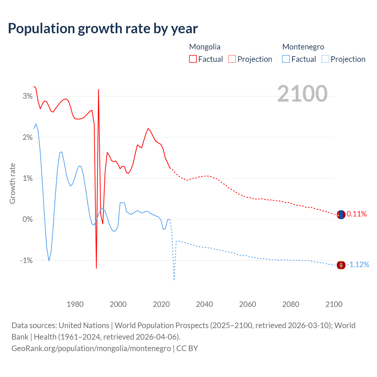 - For the last 10 years, Mongolia has had an average growth rate of +1.79% per year vs +0.01% in Montenegro.