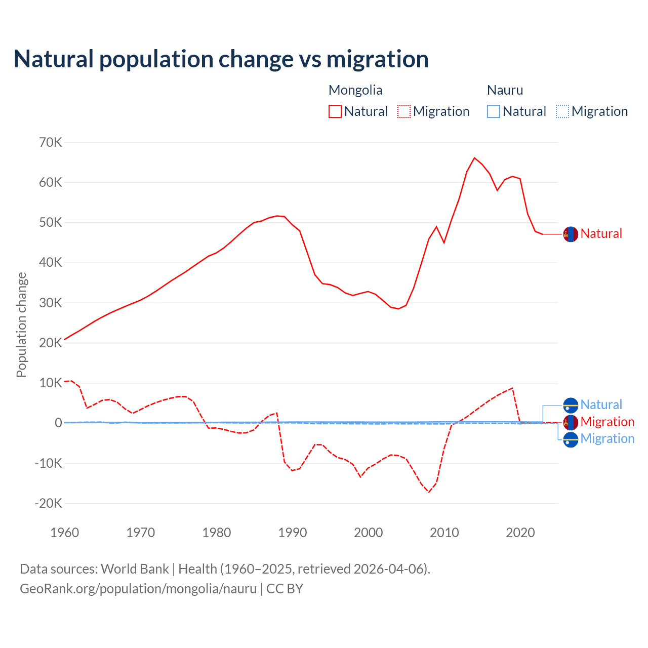 Over the last 10 years, 94.1% of the population change in Mongolia is from natural causes (a gain of 580,367 people) and 5.87% is from migration (a gain of 36,163 people). In Nauru 66.2% is from natural causes (a gain of 2,590 people) and 33.8% is from migration (a loss of 1,320 people).