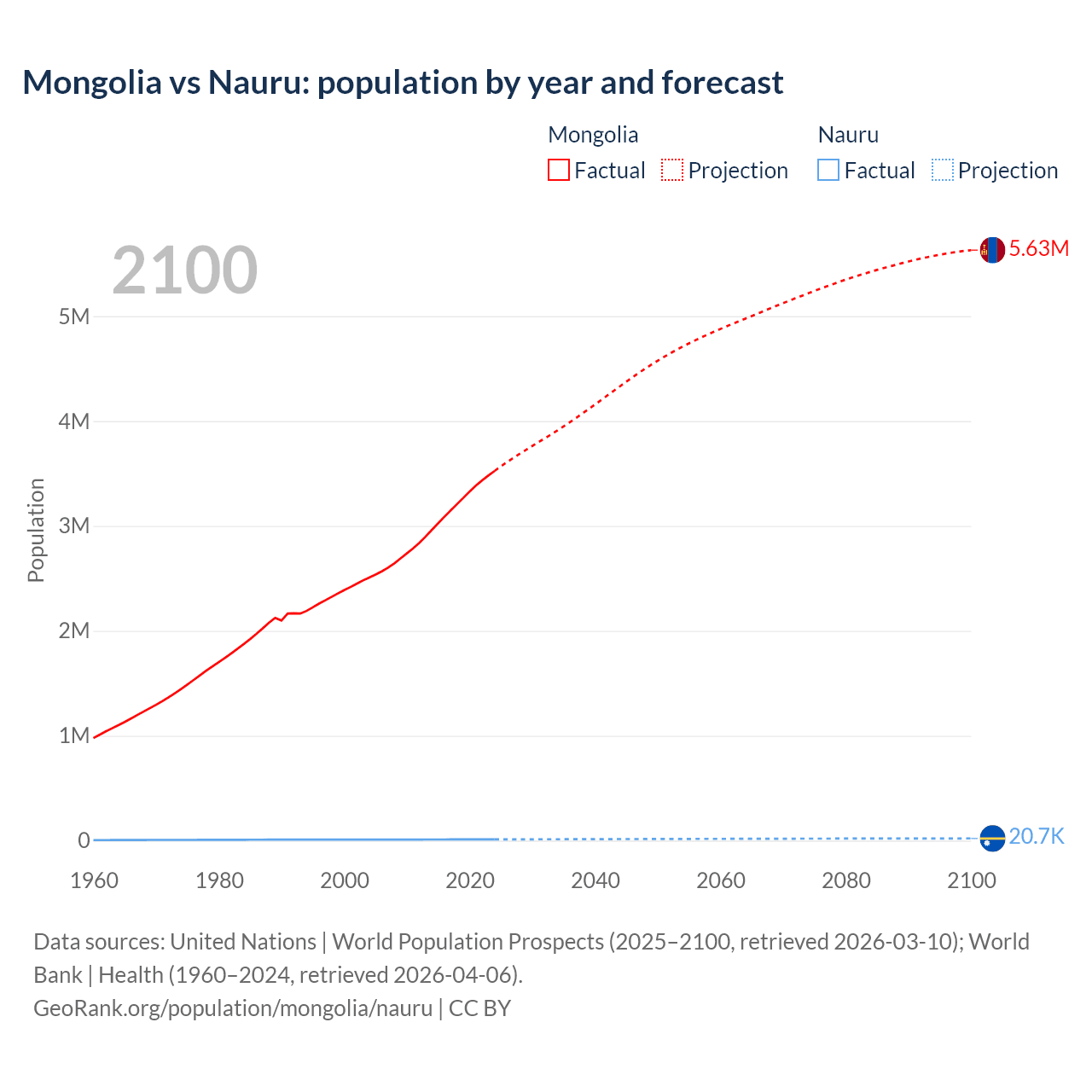 The latest officially reported population of Mongolia was 3,524,788 in 2024 vs 11,947 people in Nauru in 2024. In 2026, based on the adjusted UN estimation, the current Mongolia's population is 3,620,317 people compared to 12,125 in Nauru.