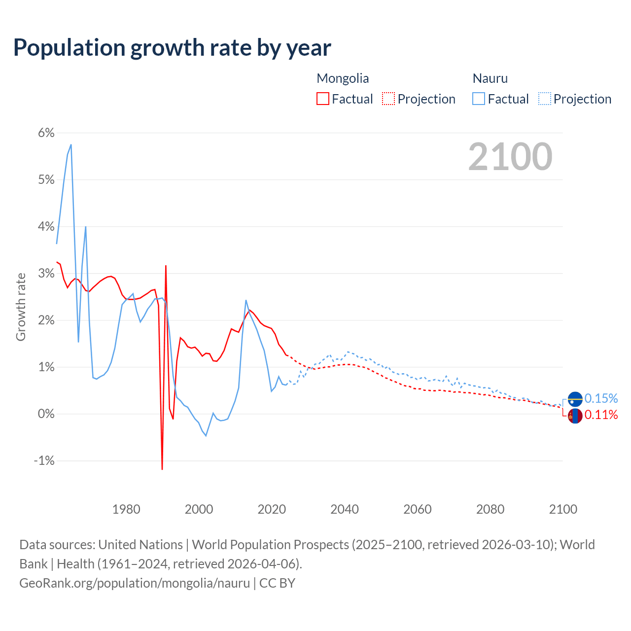 - For the last 10 years, Mongolia has had an average growth rate of +1.79% per year vs +1.17% in Nauru.