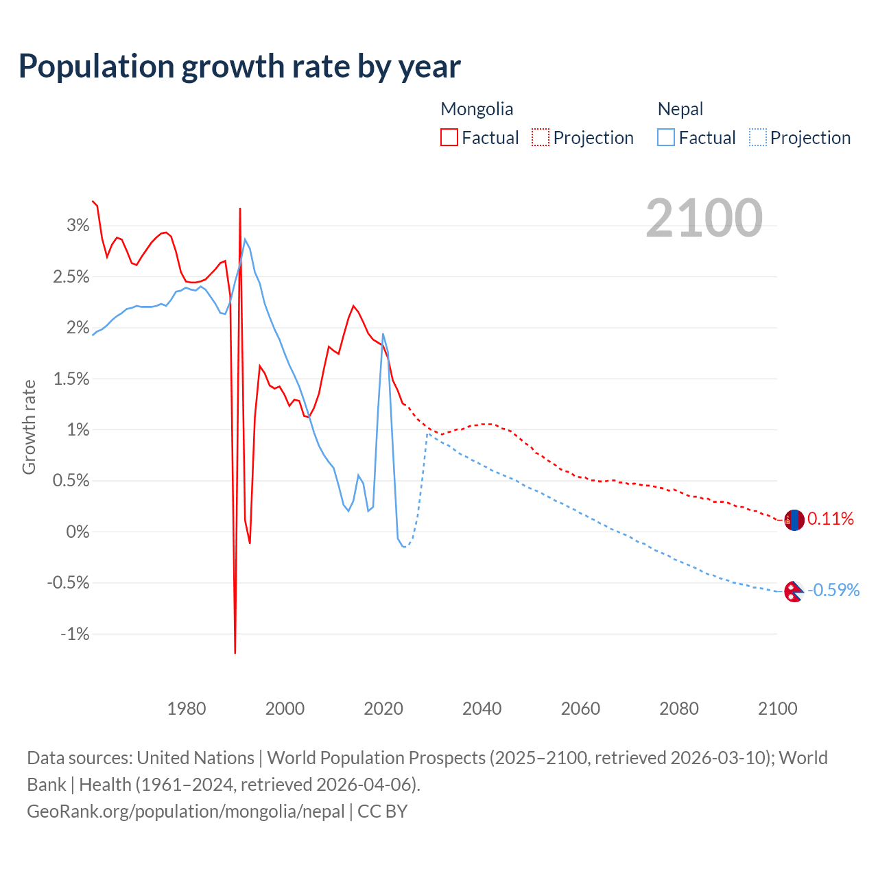 Mongolia vs Nepal: population by year and forecast