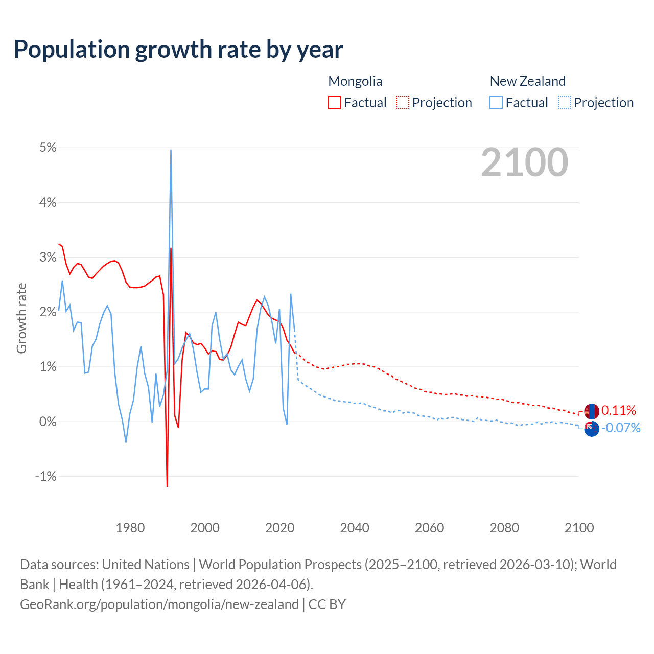 - For the last 10 years, Mongolia has had an average growth rate of +1.79% per year vs +1.6% in New Zealand.